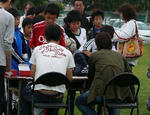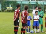 基礎練習が終ったところで子供たちを8つのグループに分けて選手とのミニゲーム。